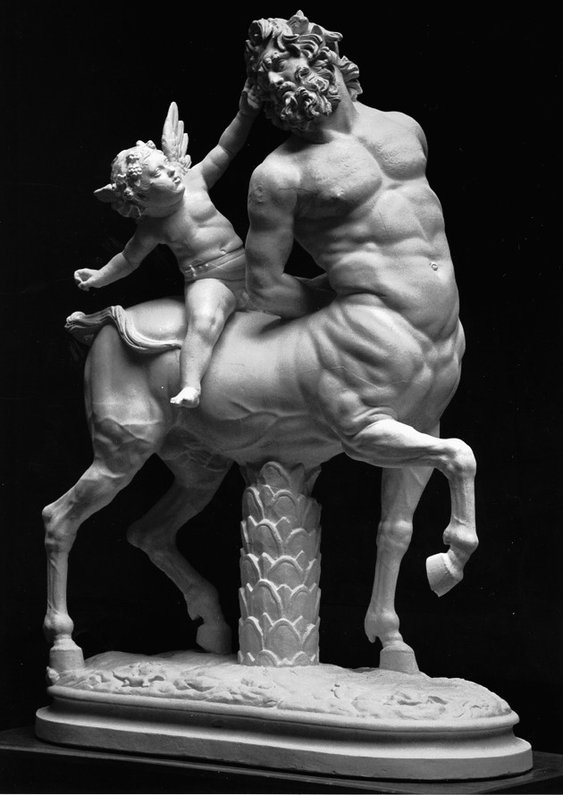 Dass nun gerade die Kentauren solcherart vorgeführt werden, hängt mit den Charaktereigenschaften zusammen, die diesen Mischwesen, die nach dem Mythos aus den waldreichen Bergen Thessaliens stammten, in der Antike zugeschrieben wurden. Was diesen Untieren – halb Mensch, halb Pferd – fehlt, ist die Kunst, die Gaben der Götter maßvoll zu genießen. Ihre Hybris führt sie zur Trunksucht, zum Jähzorn und zur Aufgabe der sexuellen Selbstbeherrschung. Vor allem lieben sie den Wein, unter dessen Einfluß sie sich besonders leicht zu ihren Schandtaten hinreißen lassen. So werden die Pferdemenschen zum Symbol für ungebührliches und unbeherrschtes Benehmen. Gerade ihre Weingier prädestiniert die Ungeheuer dann auch für das Gefolge des Dionysos, in das sie im 4. Jh. v. Chr. aufgenommen werden. Als Gefolgschaft dieses Gottes ist auch unser Kentaurenpaar durch seine Kränze gekennzeichnet. Die Pferdemenschen stehen also nicht nur unter dem Einfluß des Gottes der Liebe, sondern auch unter dem des Weingottes.