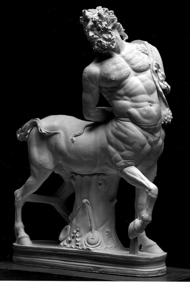 Die Statue eines alten, gefesselten Kentauren ist, neben einigen Kopfrepliken, in zwei mehr oder weniger vollständigen römischen Kopien überliefert. Das eine Stück wurde 1736 von dem späteren Kardinal Alessandro Furietti bei Ausgrabungen in der sog. »Accademia« der Villa Hadriana bei Tivoli gefunden. Es befindet sich heute in den Kapitolinischen Museen in Rom. Die Statue ist in grauschwarzem Bigio morato gearbeitet und auf der Basis von den aus dem kleinasiatischen Aphrodisias stammenden Kopisten Aristeas und Papias signiert. Die Figur wurde vermutlich speziell für die Ausstattung der Villa Hadriana geschaffen und ist in späthadrianische Zeit zu datieren. Eine weitere Replik dieses Typus, der sogenannte »Kentaur Borghese« kam bereits Anfang des 17. Jhs. bei Ausgrabungen auf dem Caelius zu Tage, wo die aus weißem Marmor gefertigte Statue, die wohl in flavischer Zeit entstanden ist, eine der reichen Vorstadtvillen Roms schmückte. Die Skulptur gelangte bald nach der Auffindung in die Sammlung Borghese, die später nach Paris überführt wurde.